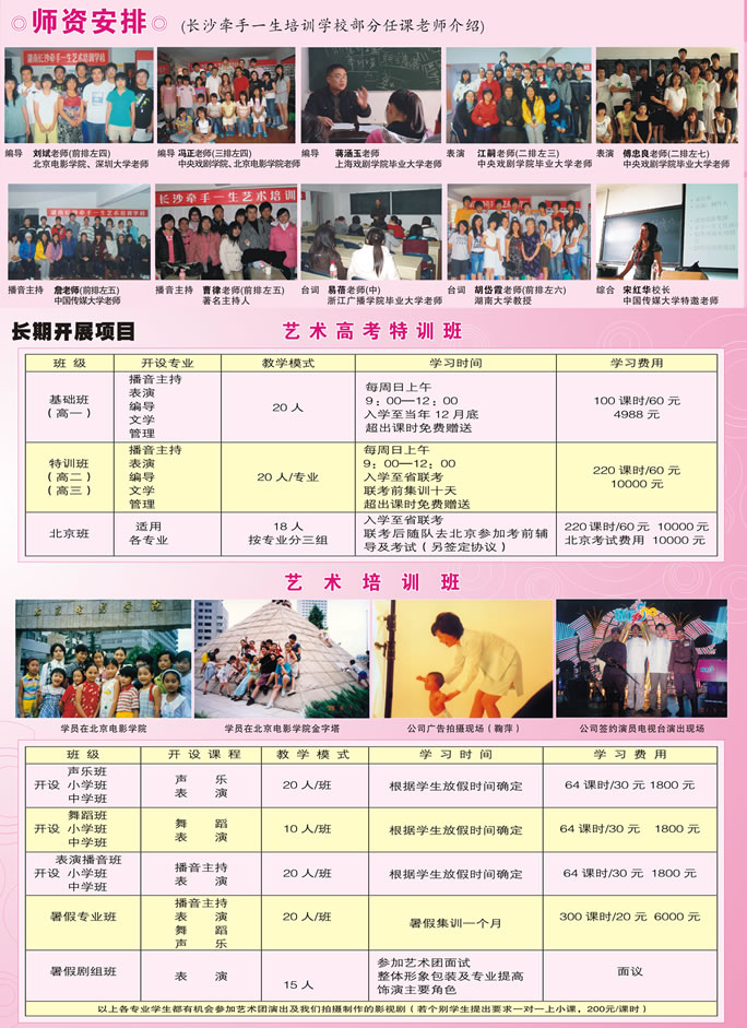 学习时间:每周2次,每周日上午9:00——12:00(赠送每周六晚声乐课时)暑假或省联考前集训十天